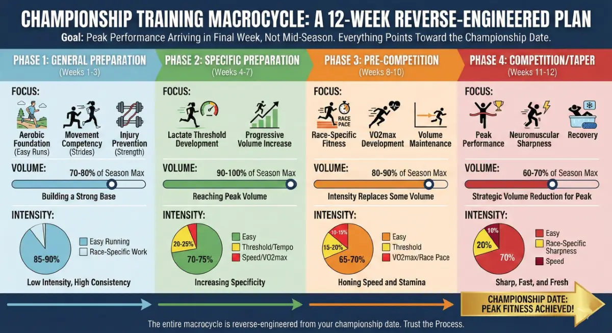 The entire macrocycle is reverse-engineered from your championship date. Everything points toward peak fitness arriving in that final week, not in week 6 when it doesn’t matter.