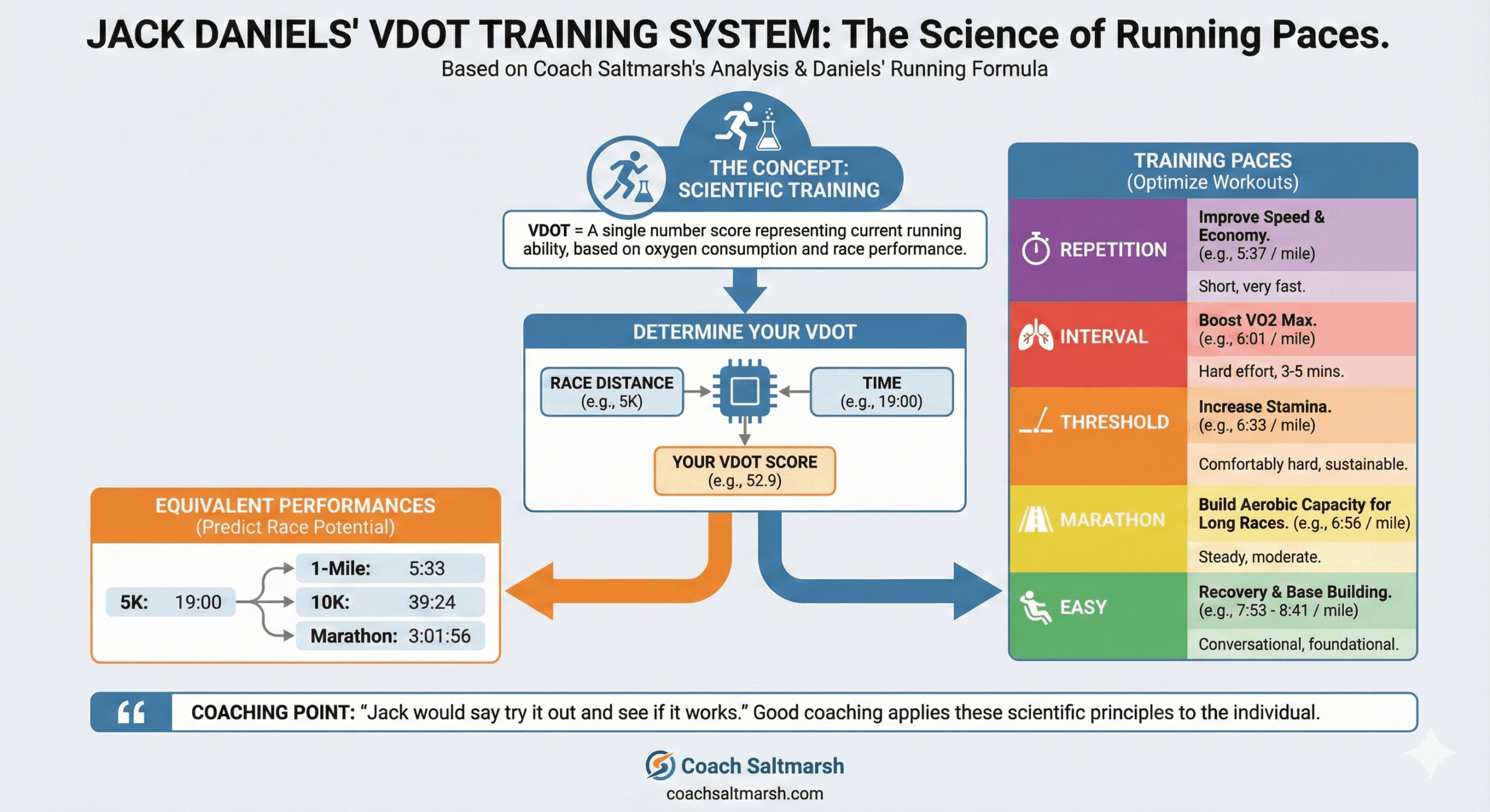 Daniels is first and foremost a scientist. His unbiased approach to coaching is based on physiological adaptations to running and racing as well as experimentation and methodical analysis of all data collected. When asked about alternative approaches to coaching, Brian Rosetti, the founder of the Run SMART project and the VDOT O2 app, (both based on the Daniels’ training philosophy) said that “Jack would be the first person to say try it out and see if it works.”