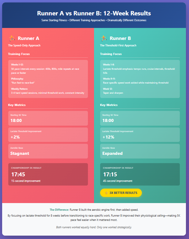 Runner A spends twelve weeks doing nothing but 5K pace intervals—400s, 800s, mile repeats, all at race pace or faster. She gets really good at running hard, but her aerobic base stays stagnant.