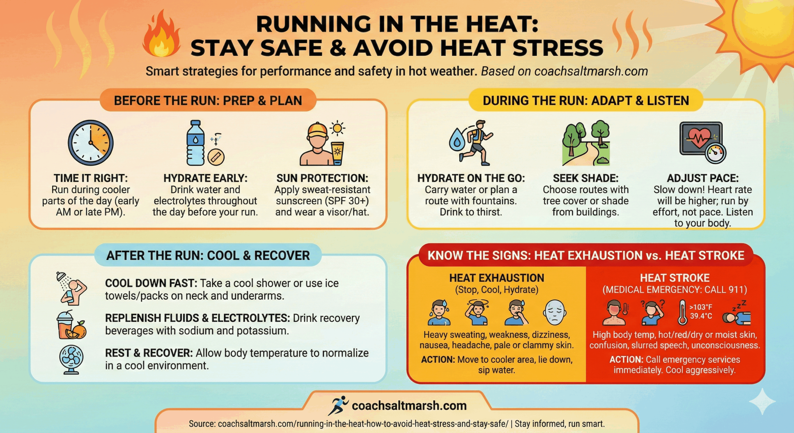 Run early or late. Summer long runs usually start in the 5 o’clock hour. Things heat up quickly after 7am. Night running is also popular with lots of runners, but make sure your safe out there.