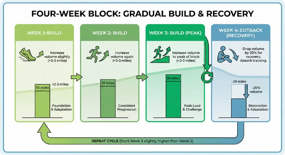 - Build Week 1: Increase volume slightly (e.g., add 2-3 miles total to the week).
